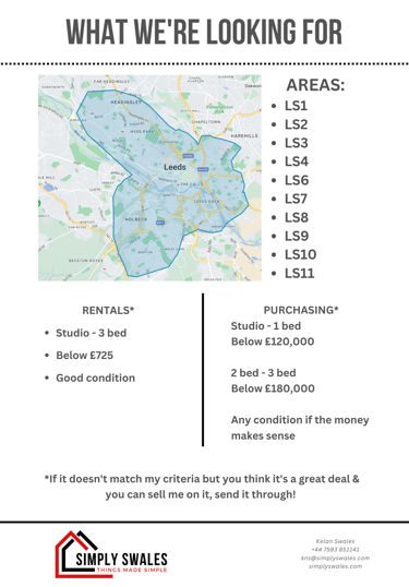 I searched for potential rental deals on Rightmove, then I noted down the agency, giving me a conversation starter when I went into the agency. Along with this, I had some marketing material - a makeshift A4 poster explaining exactly what I'm looking for in Leeds. It had my company details on there, including my contact details. I used this because I didn't have my professional leaflets yet, but it's also useful if you're trying to save money! (Which I always am).